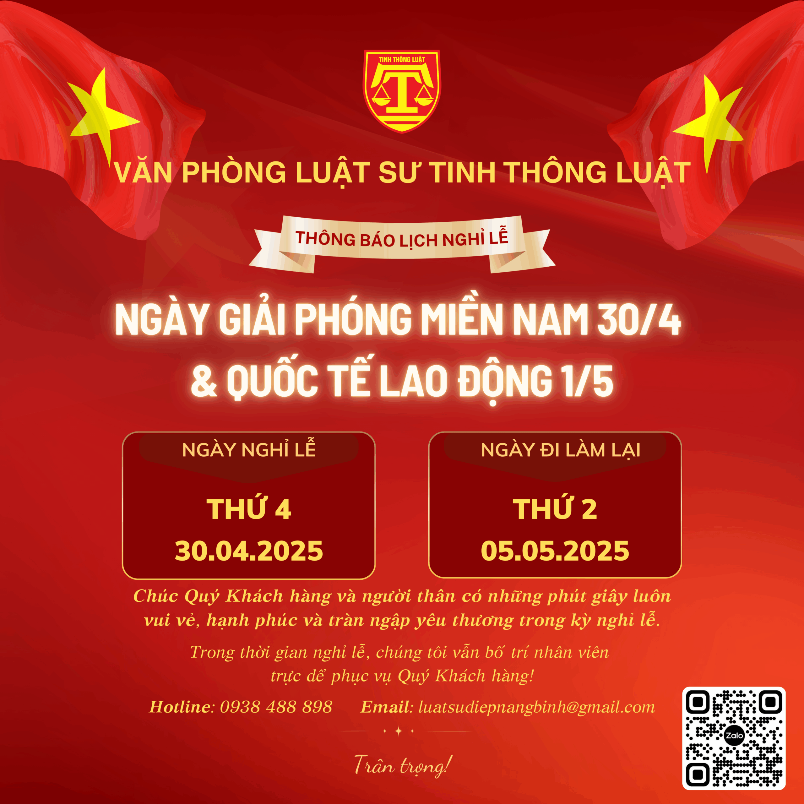 Văn phòng Luật sư Tinh Thông Luật xin trân trọng thông báo lịch nghỉ lễ Giải phóng miền Nam 30/4 và Quốc tế Lao động 1/5 năm 2025 như sau: